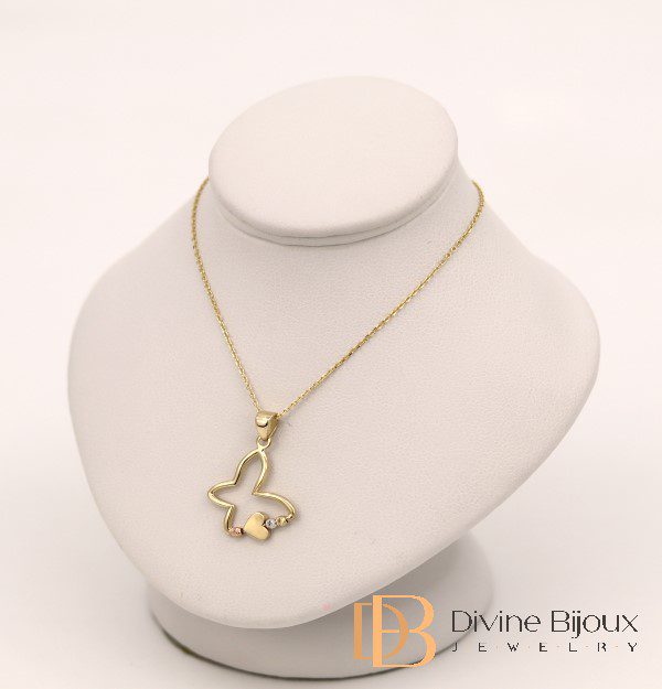 Colier de dama din aur alb, roz si galben cu pandant fluture si inimioara.