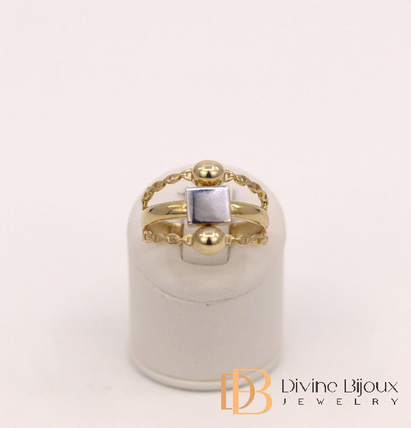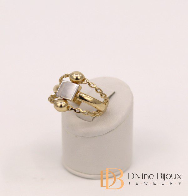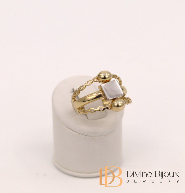 Inel de dama din aur alb si galben cu doua benzi de efect decorata cu bile si patrat.